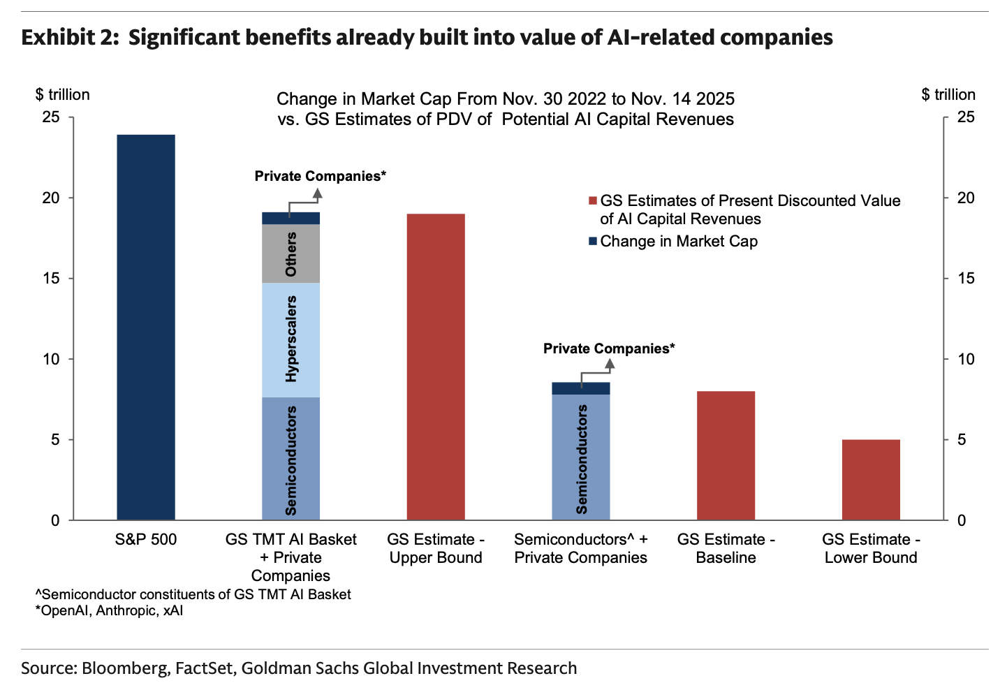 Since the introduction of ChatGPT in November 2022, Goldman calculates the value of companies directly involved in or adjacent to the AI boom has risen by over $19 trillion. This surge includes major gains in the semiconductor space and among “hyperscalers,” as well as almost $1 trillion for the latest valuations of the three largest private AI model providers.