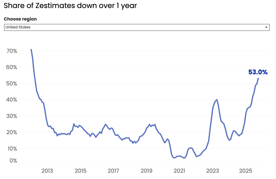 In October, 53% of homes saw their “Zestimates” decline, the most since 2012 and up from just 16% a year earlier. Losses were most widespread in the West and South.