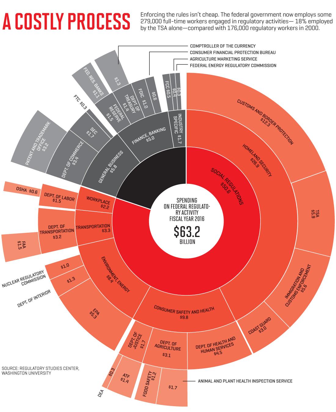 The attacks of Sept. 11, 2001, then prompted the creation of the Department of Homeland Security, which, with a fiscal 2016 budget of $27 billion, now accounts for 43% of the government’s spending on regulations.