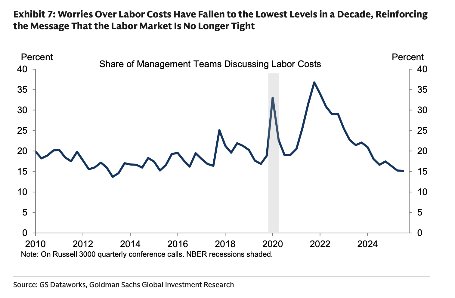 These AI-related hiring cuts occur amid a broader easing in the U.S. labor market. Company commentary confirmed that job growth remains tepid, and the labor market is softer than it was immediately prior to the pandemic. This increased “slack” has led to reduced concerns about compensation. Mentions of wages and labor costs in earnings calls have fallen to the “lower end of the pre-pandemic range,” reinforcing the message that executives are not worried about wages growing out of control anymore.